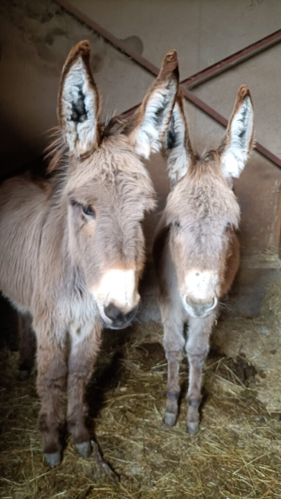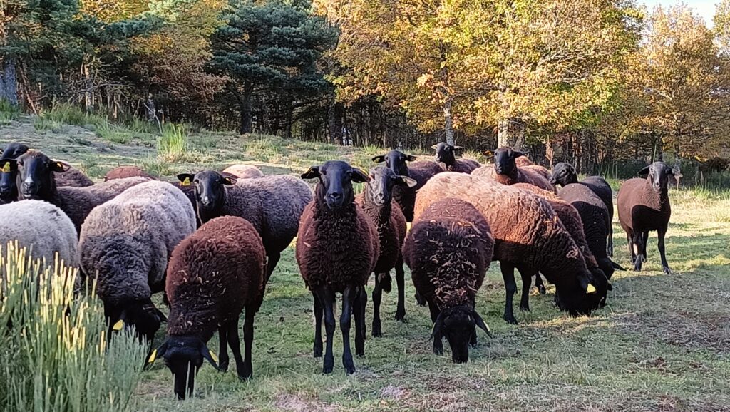 Notre exploitation agricole est passée en agriculture biologique au printemps 2022, elle se compose de plusieurs productions : une production ovin viande, avec un troupeau de brebis de race locale : Les Noires du Velay. et de 2 ânesses, qui s’occupent de la protection du troupeau.
